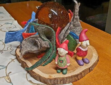 ich hab das Filzknäuel betrachtet und hatte den Einfall das Knäuel so zu belassen, wie es mir zugeschickt wurde und es als Untersetzer für eine kleine Klangschale zu verwenden. Sieht gut aus finde ich!